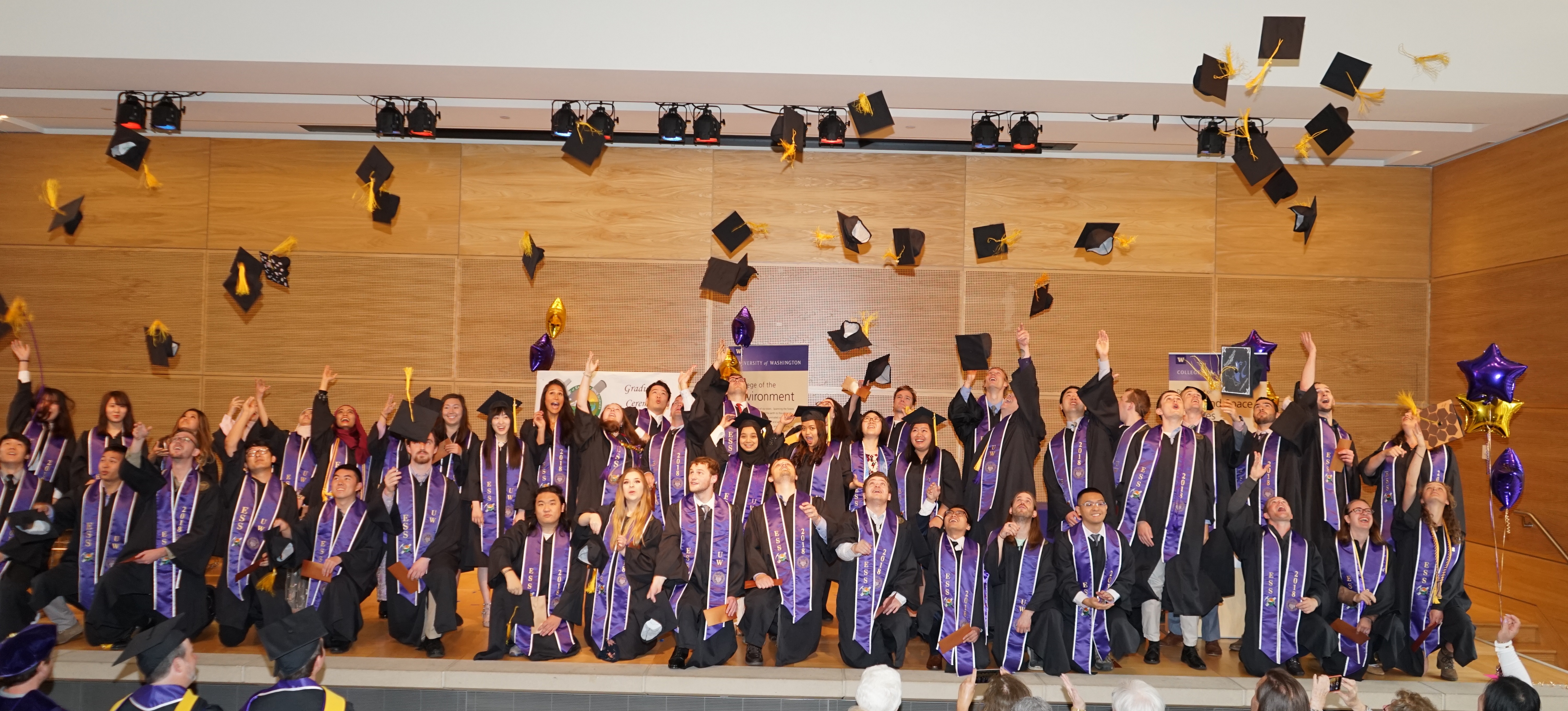 On Saturday June 9th, 2018, over 400 people gathered in the HUB Lyceum on the University of Washington Campus to celebrate the UW Dept of Earth and Space Sciences annual Graduation Ceremony, hosted by Chair Bruce Nelson. Receiving diplomas were 46 undergraduate students, out of a graduating class of 85. Receiving hoods were 9 out of a class of 12 Masters students, and 9 out of a class of 13 PhD students. This is one of our larger graduating classes so we again held the ceremony in the HUB Lyceum auditorium with seating for 400, as our previous locations in Johnson Hall and Bagley Hall are not adequate. In addition to the live audience, this ceremony was witnessed by 102 live videostreams to six countries around the world. A reception was held in the HUB Lobby outside the Lyceum following the ceremony.
