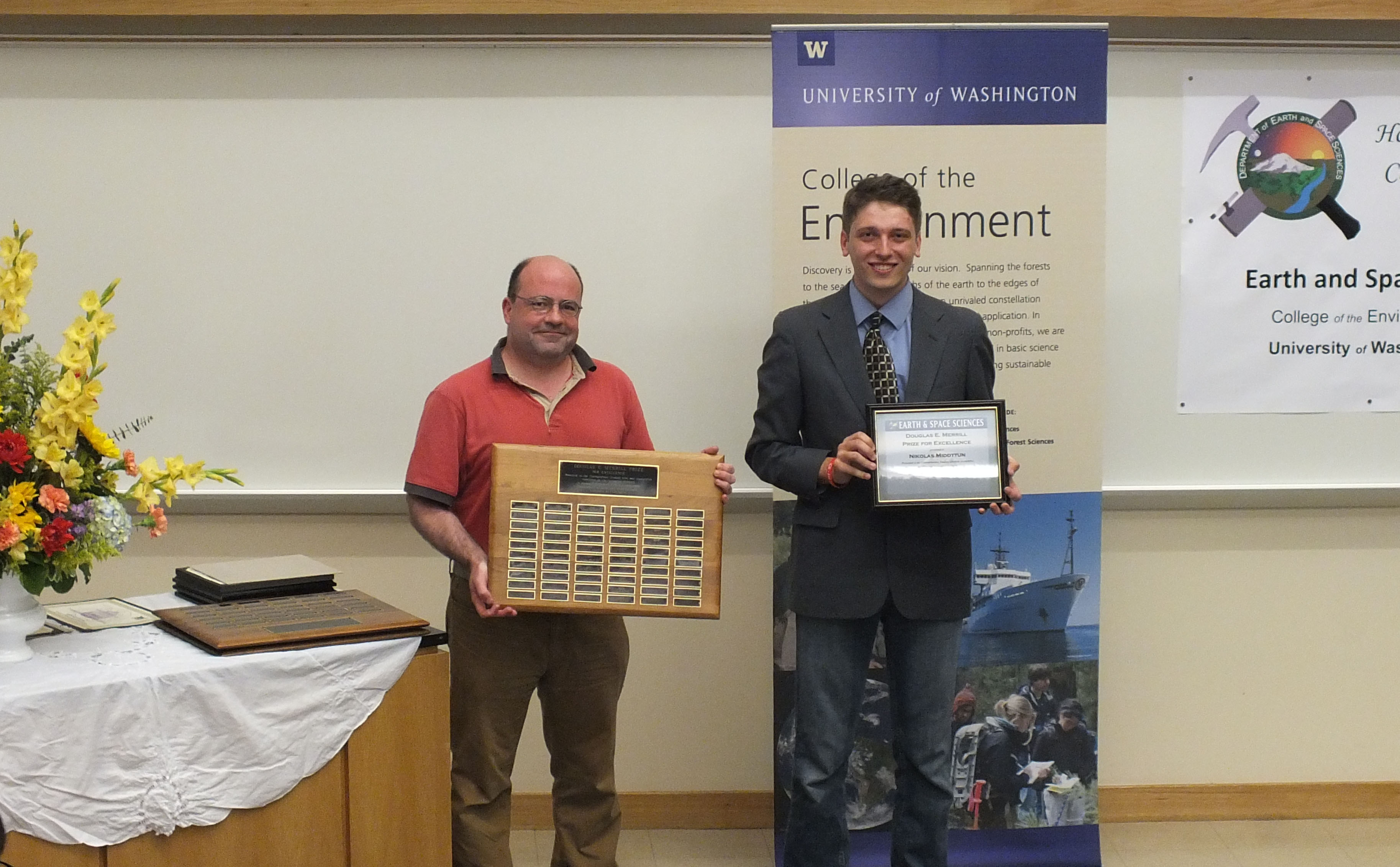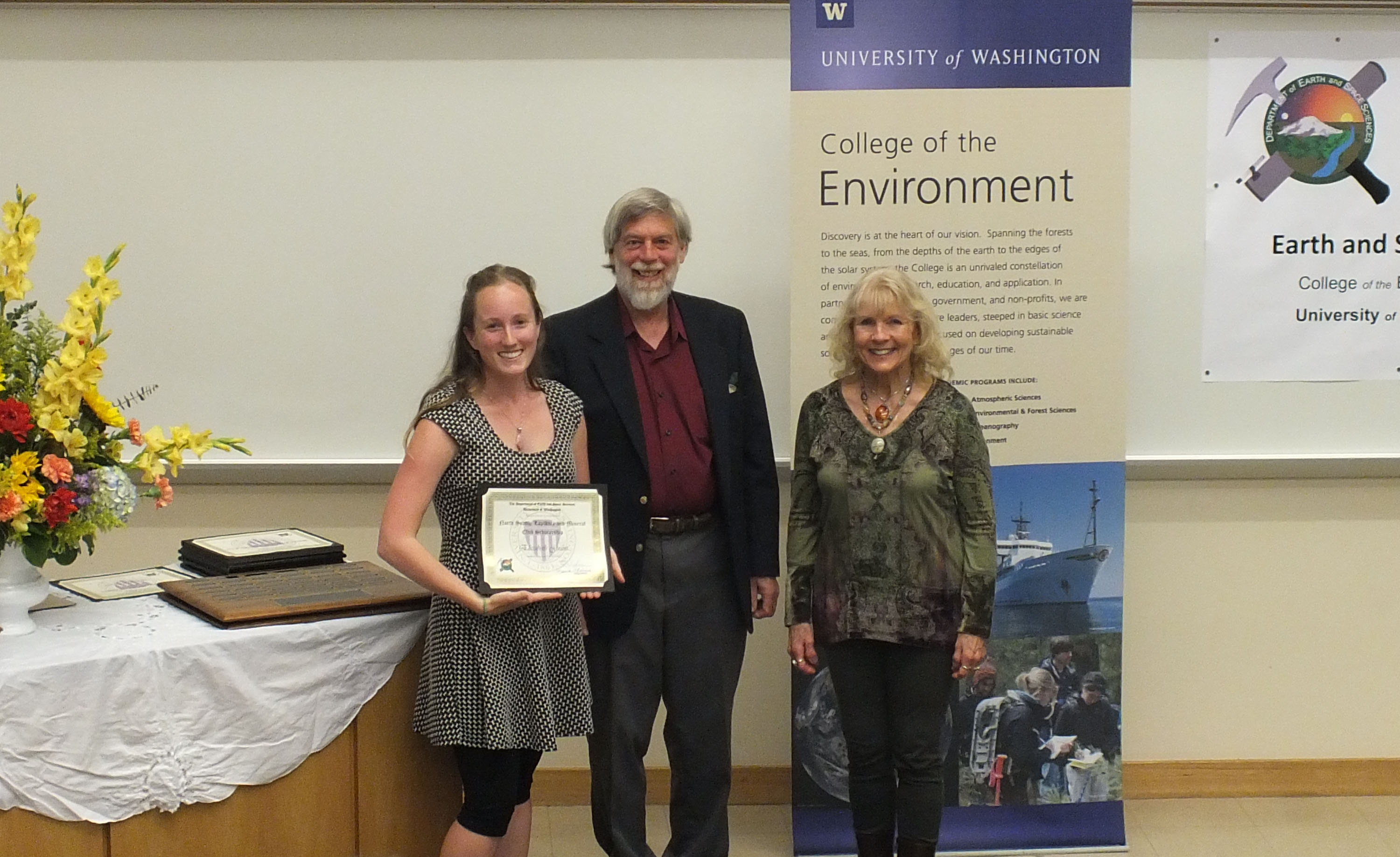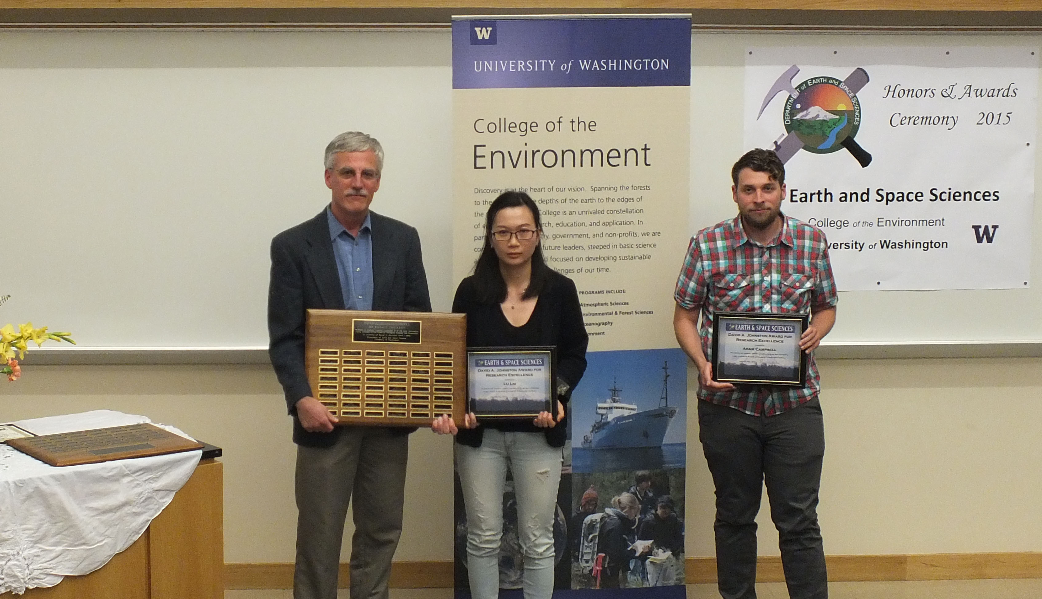 The 2015 Honors and Awards Ceremony was held on Wednesday May 20th at 4:40 pm in JHN-102, hosted by ESS Chair Robert Winglee. There were numerous honors, awards, and scholarships given during this ceremony before adjourning to a reception in the Johnson Hall Courtyard.