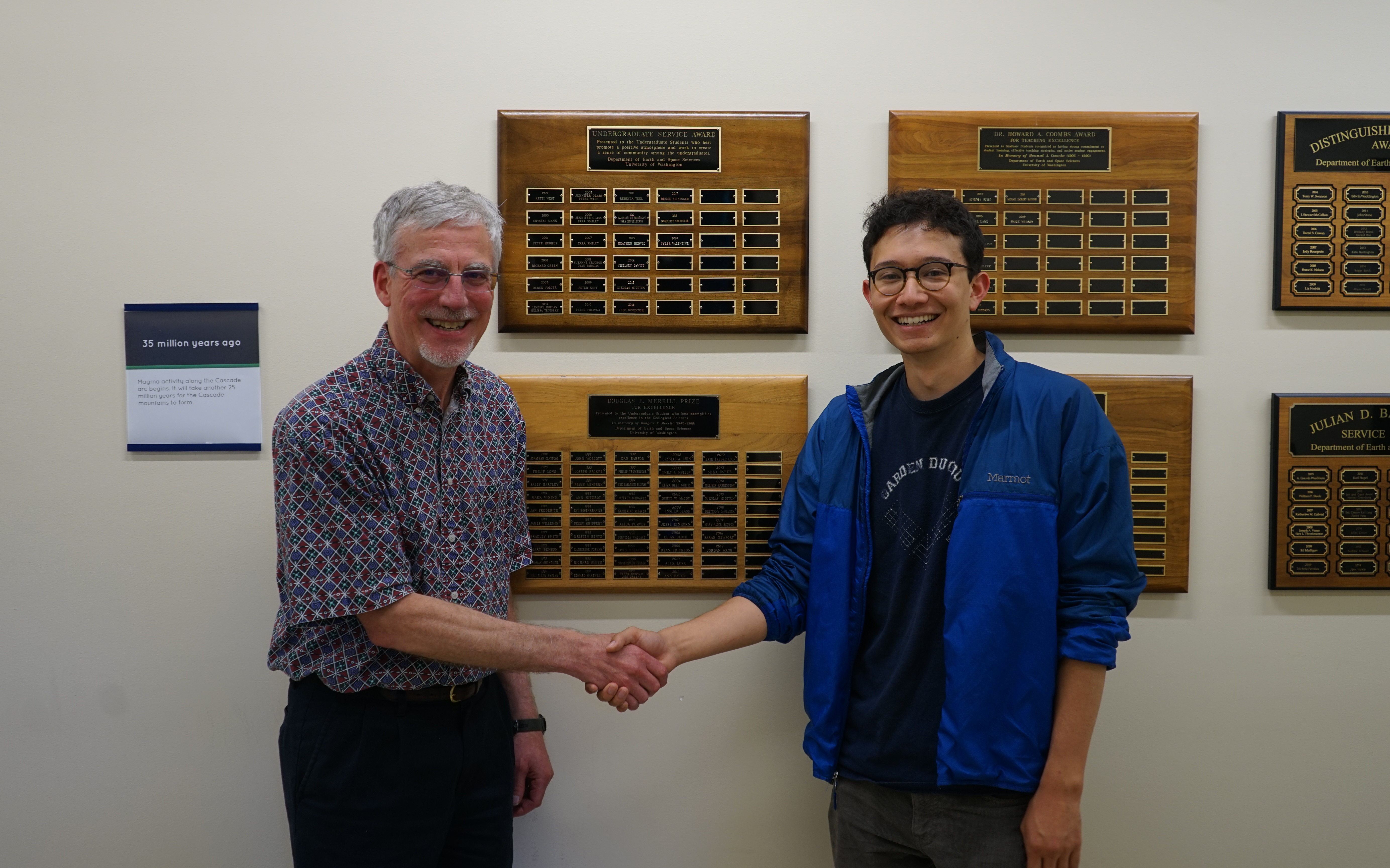 Paige Wilson receiving the Howard Coombs Fellowship for Teaching Excellence from David Catling.