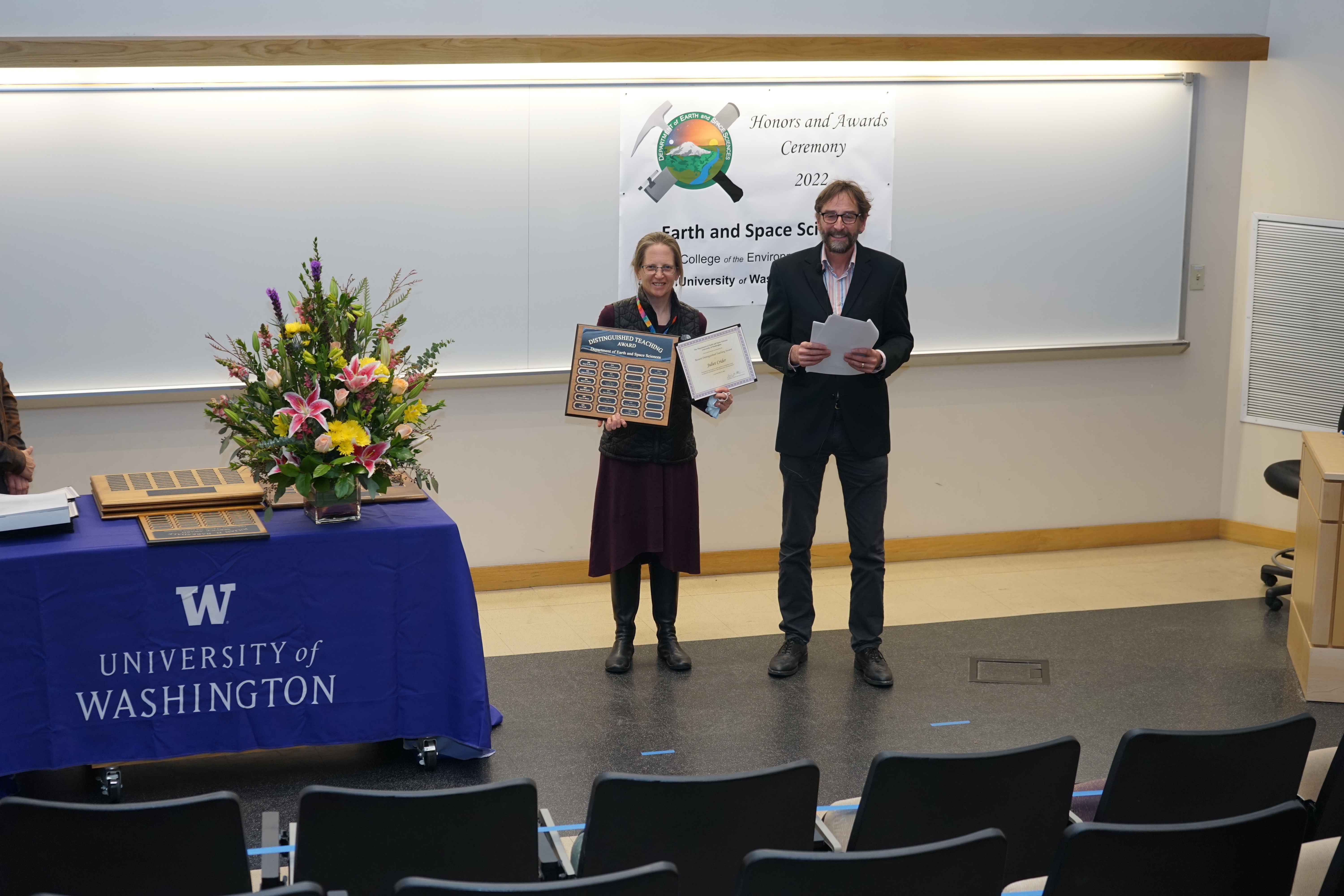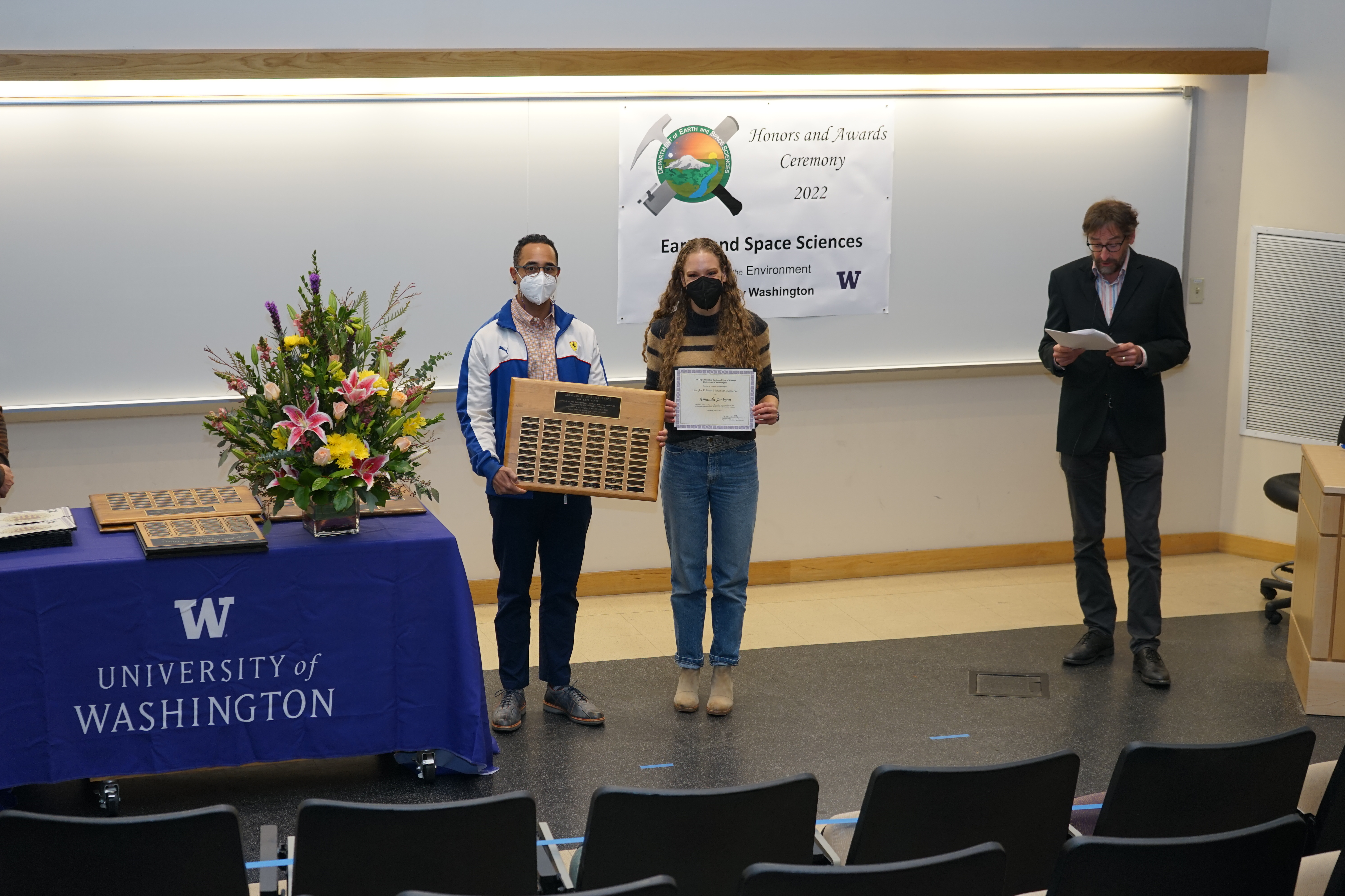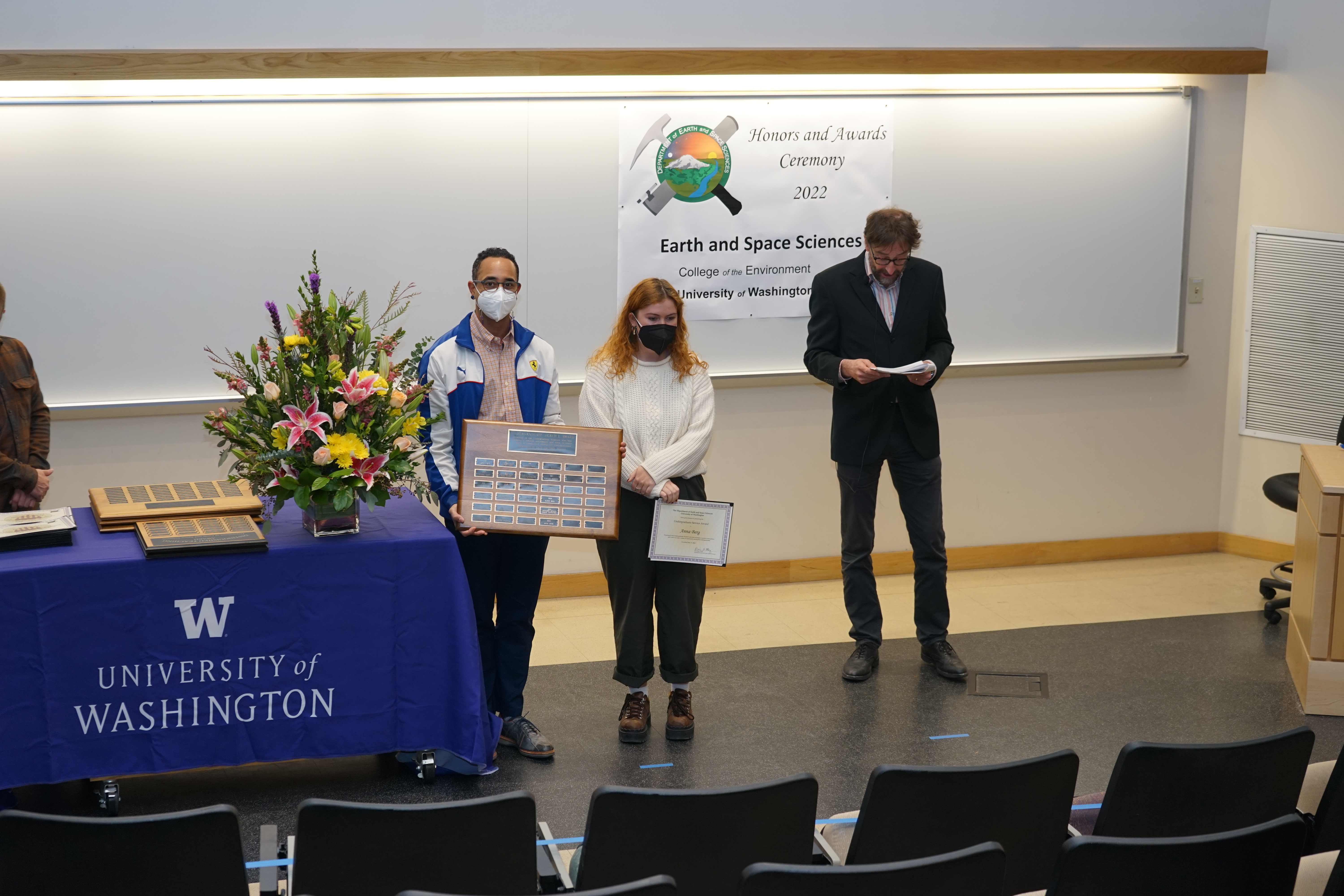 The 2022 UW Dept of Earth and Space Sciences Honors and Awards Ceremony was held on Friday, May 12 at 3:30 PM in JHN-102, hosted by ESS Chair Eric Steig. There were numerous honors, awards, and scholarships given during this ceremony before adjourning to a reception in the Johnson Hall Courtyard.