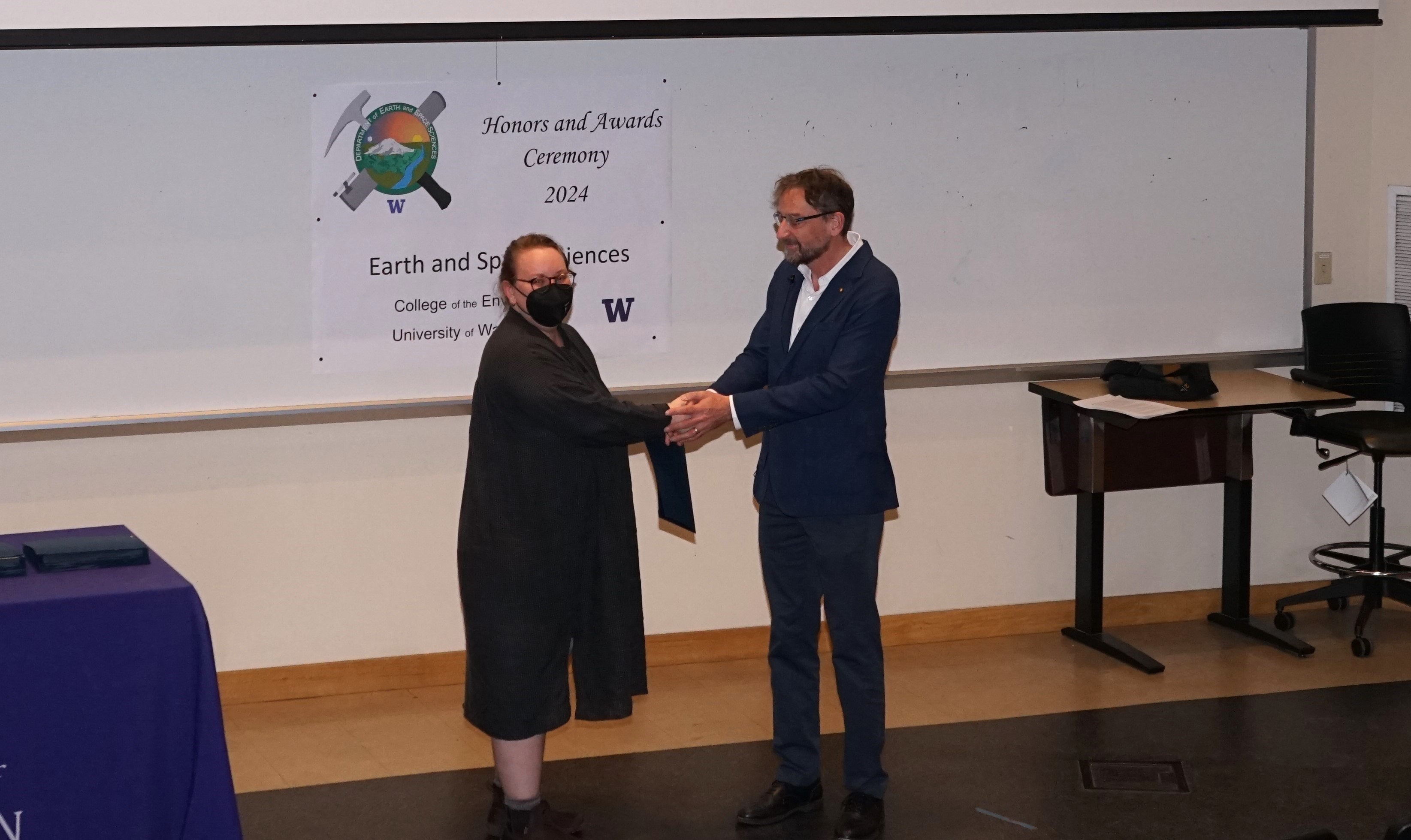 The 2024 UW Dept of Earth and Space Sciences Honors and Awards Ceremony was held on Friday, May 12 at 3:30 PM in JHN-102, hosted by ESS Chair Eric Steig. There were numerous honors, awards, and scholarships given during this ceremony before adjourning to a reception in the Johnson Hall Courtyard.
