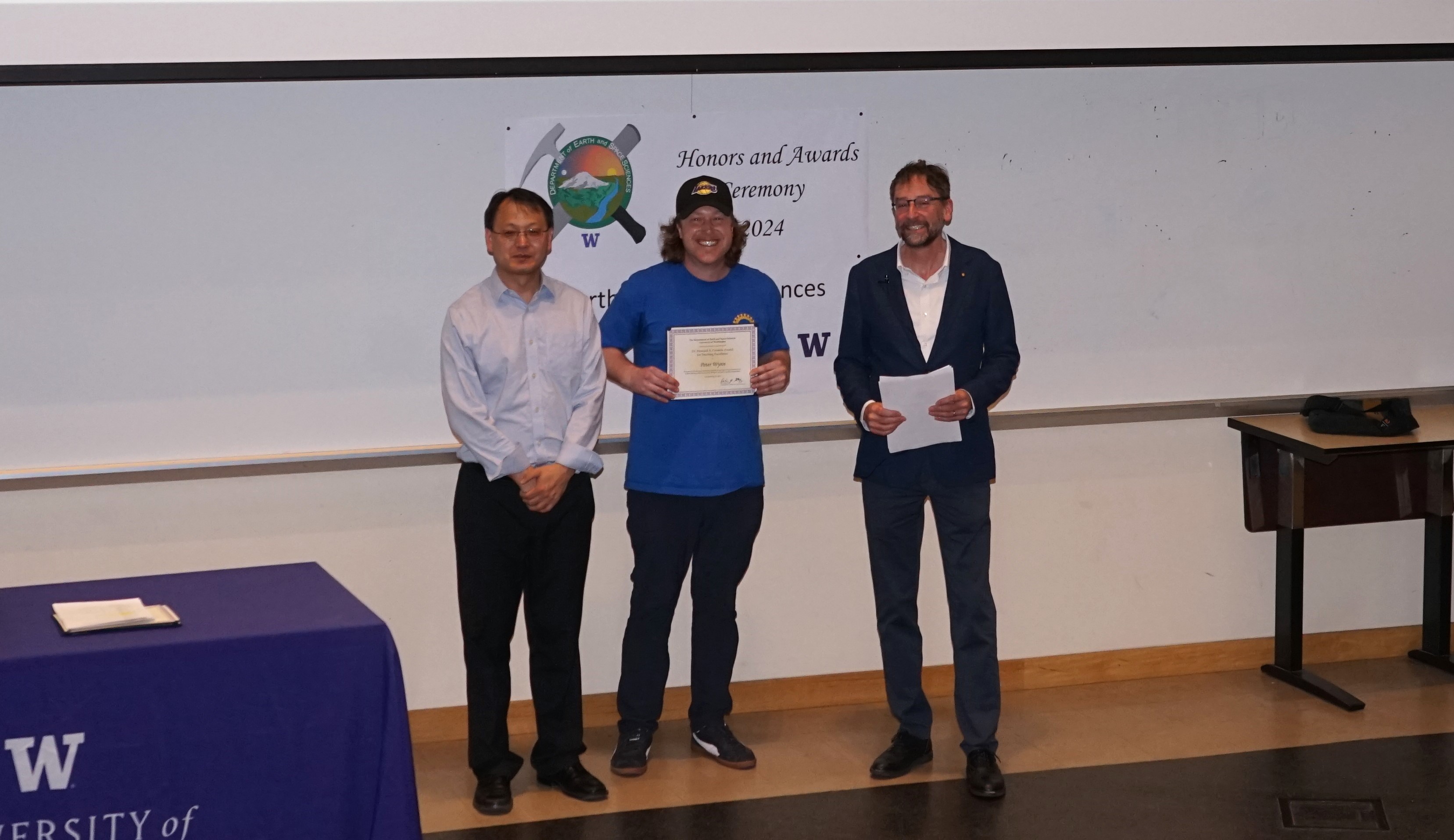 Peter Wynn receiving the Howard Coombs Fellowship for Teaching Excellence from Fangzhen Teng and Eric Steig.